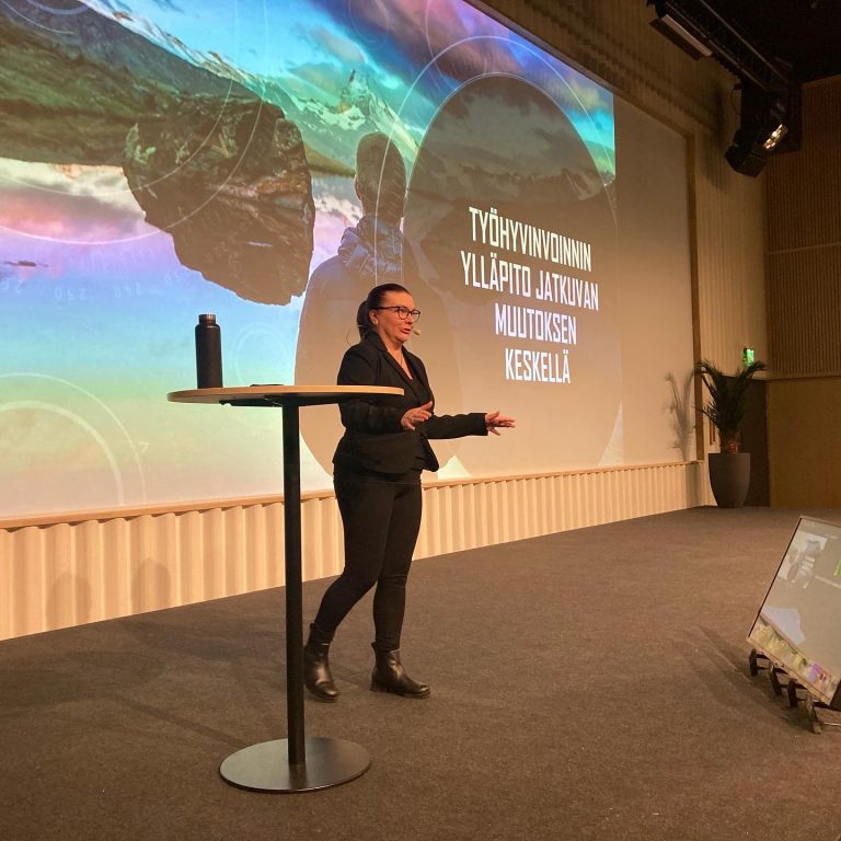 Kreisi luennoitsija tekee puolestaan osallistujille harjoitteita, jotka kulkevat mukaan myös työpaikan kahvipöytä keskusteluihin.